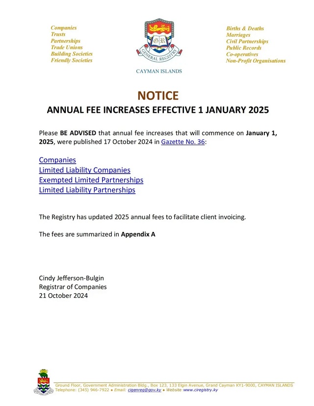 根據(jù)開曼群島金融服務(wù)部于2024年10月21日正式發(fā)布的公告,隨著《公司法》(2024年附表5 修正案),《有限責(zé)任公司(費(fèi)用)》(2024年修正案),《豁免有限合伙企業(yè)(第2號(hào))實(shí)施細(xì)則》(2024年修正案),《有限責(zé)任合伙企業(yè)(費(fèi)用)實(shí)施細(xì)則》(2024年修正案) 等一系列修正案在政府憲報(bào)刊登,公司、有限責(zé)任公司、豁免有限合伙企業(yè)和有限責(zé)任合伙企業(yè)的年費(fèi)變更將于2025年1月1日正式生效。