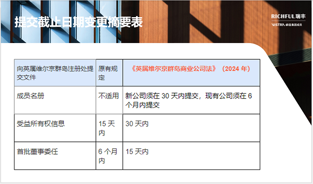 注冊代理人須在提交前核實(shí)信息,并在 30 天內(nèi)及時更新任何變更。在修訂法生效日期前成立的英屬維爾京群島實(shí)體,須在六個月內(nèi)遵守上述規(guī)定。