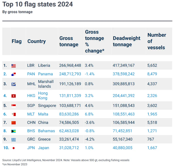 據(jù)勞氏船級社數(shù)據(jù)顯示,2024年十大船旗國排名中,前五名分別為利比里亞、巴拿馬、馬紹爾、香港和新加坡,馬耳他,其中利比里亞、巴拿馬、馬紹爾都是國際運(yùn)輸業(yè)工人聯(lián)合會(ITF)認(rèn)定的方便旗國家,而新加坡和香港也接受外國公司注冊船籍。
