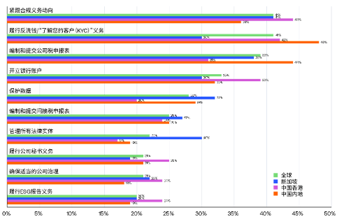 研究顯示,不同國(guó)家或地區(qū)以及不同行業(yè)在合規(guī)方面所面臨的挑戰(zhàn)存在顯著差異。中國(guó)香港和新加坡的公司在緊跟法規(guī)變化方面最為吃力,銀行、投資管理公司和企業(yè)服務(wù)提供商也面臨類似問(wèn)題。中國(guó)內(nèi)地企業(yè)最擔(dān)心的是如何履行反洗錢(qián)和“了解你的客戶(KYC)”義務(wù),而家族辦公室和咨詢公司則在保護(hù)數(shù)據(jù)方面面臨嚴(yán)峻挑戰(zhàn)。