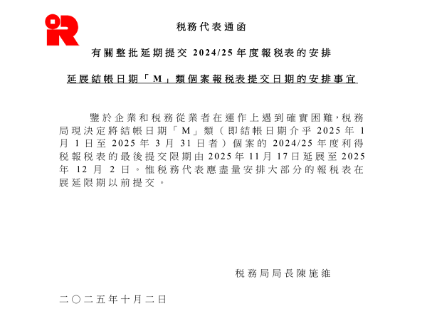 香港稅務(wù)局于2025年10月2日發(fā)布最新通告,為緩解企業(yè)年底申報(bào)壓力,正式延長(zhǎng)結(jié)賬日期「M」類公司(即財(cái)政年度結(jié)賬日期在2025年1月1日至3月31日之間)的2024/25年度利得稅申報(bào)期限——由原定的2025年11月17日延后兩周至2025年12月2日。本次延期旨在為企業(yè)提供更多準(zhǔn)備時(shí)間,但需注意12月2日為最終截止日,逾期將面臨合規(guī)風(fēng)險(xiǎn)。