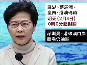 2月3日,香港特別行政區(qū)政府宣布,自2月4日零時(shí)起暫停部分口岸人員通行。陸路方面:暫停羅湖、皇崗、福田等陸路口岸人員通行,保留深圳灣口岸、港珠澳大橋口岸的正常通行,皇崗口岸大巴、小客車客運(yùn)轉(zhuǎn)由深圳灣口岸通關(guān)。