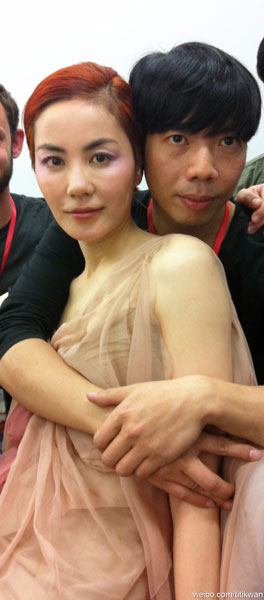 王菲被御用服裝設(shè)計師TiTi Kwan擁入懷中,引發(fā)菲迷發(fā)炮攻擊(微博圖片)