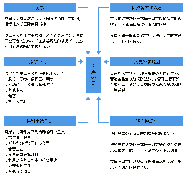 無論客戶以個(gè)人還是企業(yè)的身份均可以利用離岸公司作多種用途,其中最普遍的用途和好處包括: